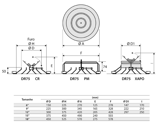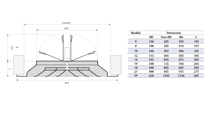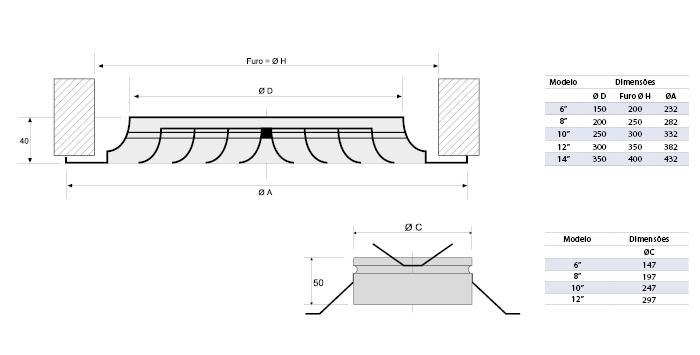 Registo: fabricado em chapa de aço galvanizado, composto por 2 meias luas que são ajustáveis manualmente